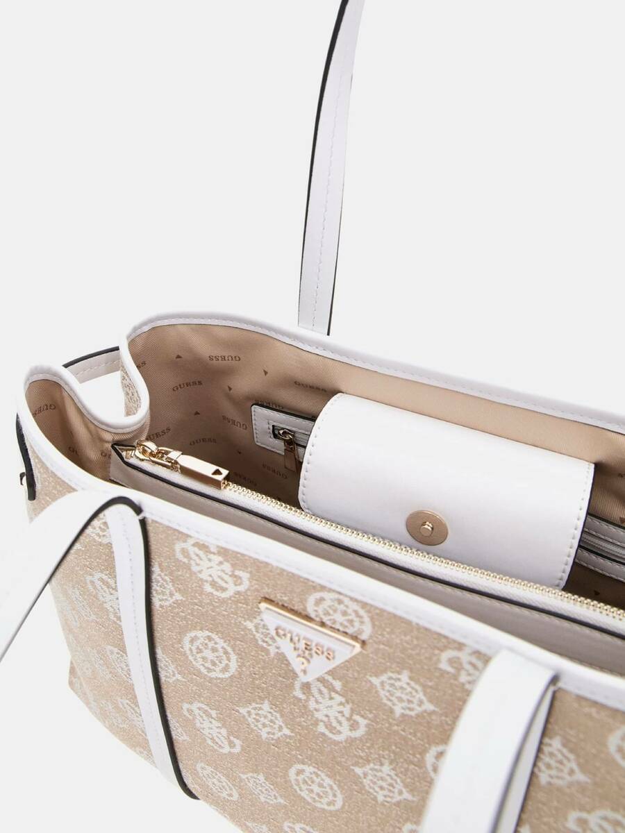 Kabelka má dvě hlavní komory rozdělené kapsou na zip, dvě přihrádky a jednu malou kapsu na zip.