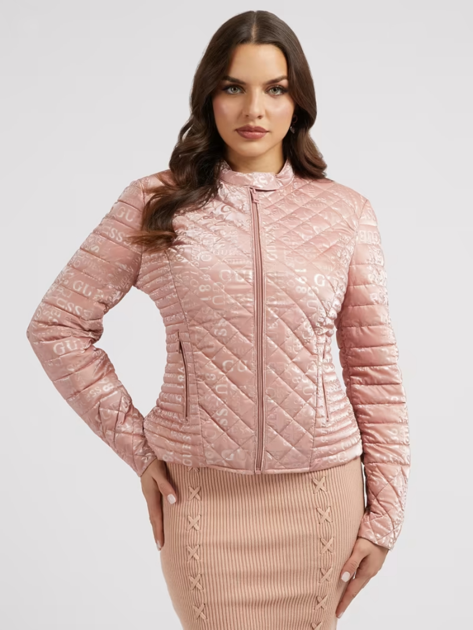 Dámská přechodová růžová bunda s potiskem od Guess.