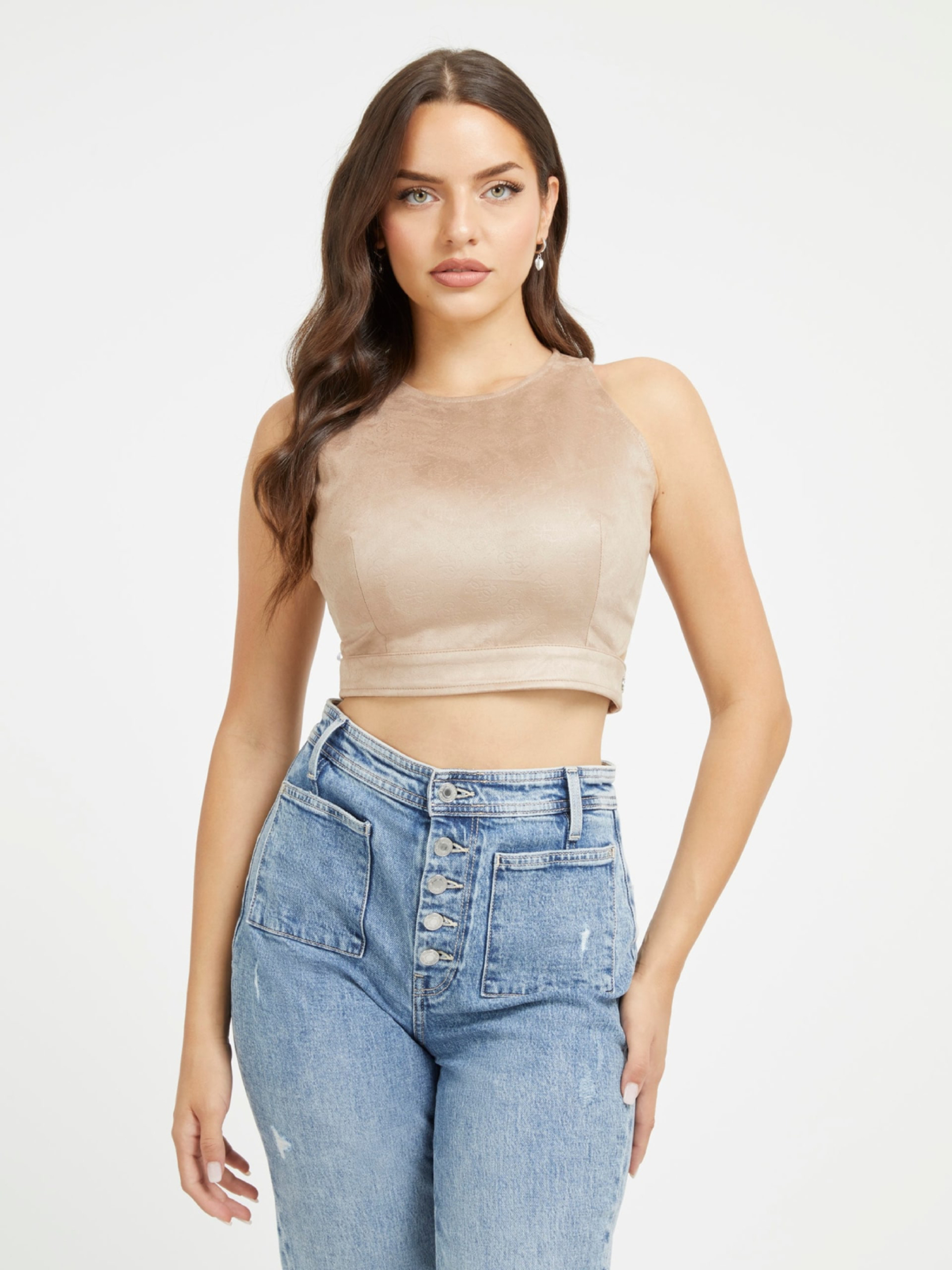 Dámský béžový crop top od Guess se semišovou úpravou.