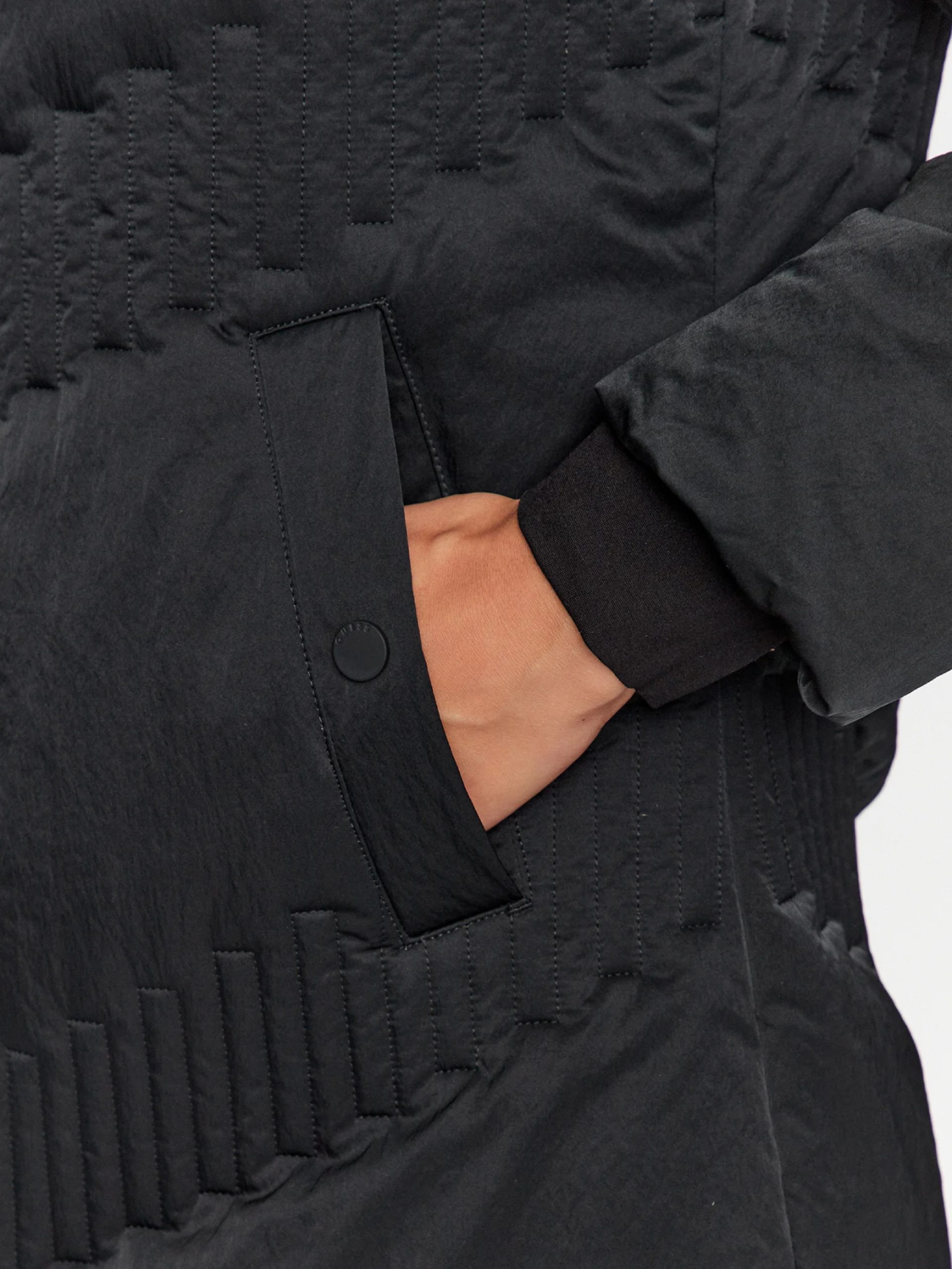 Dámský černý zimní péřový kabát od Guess.