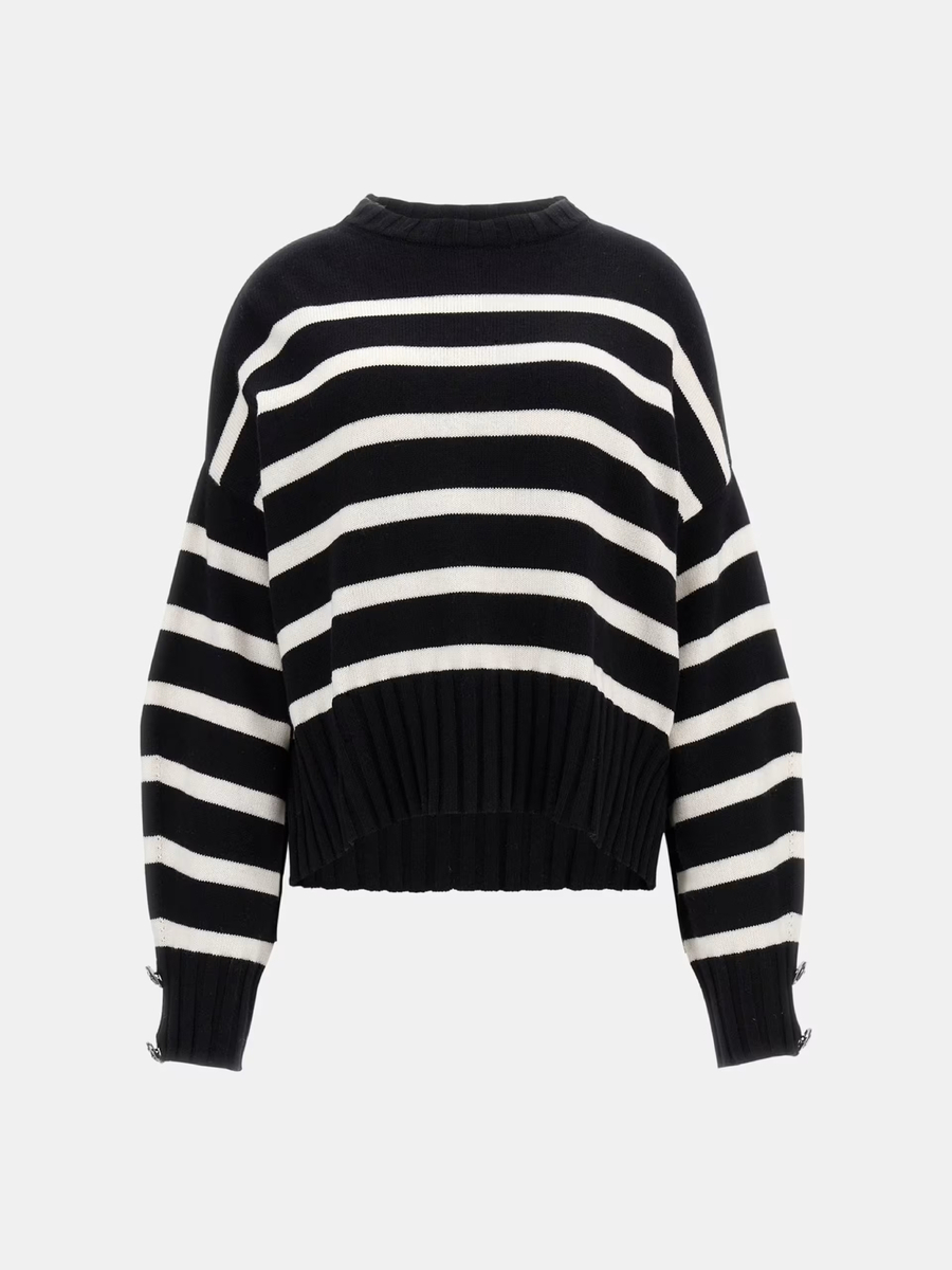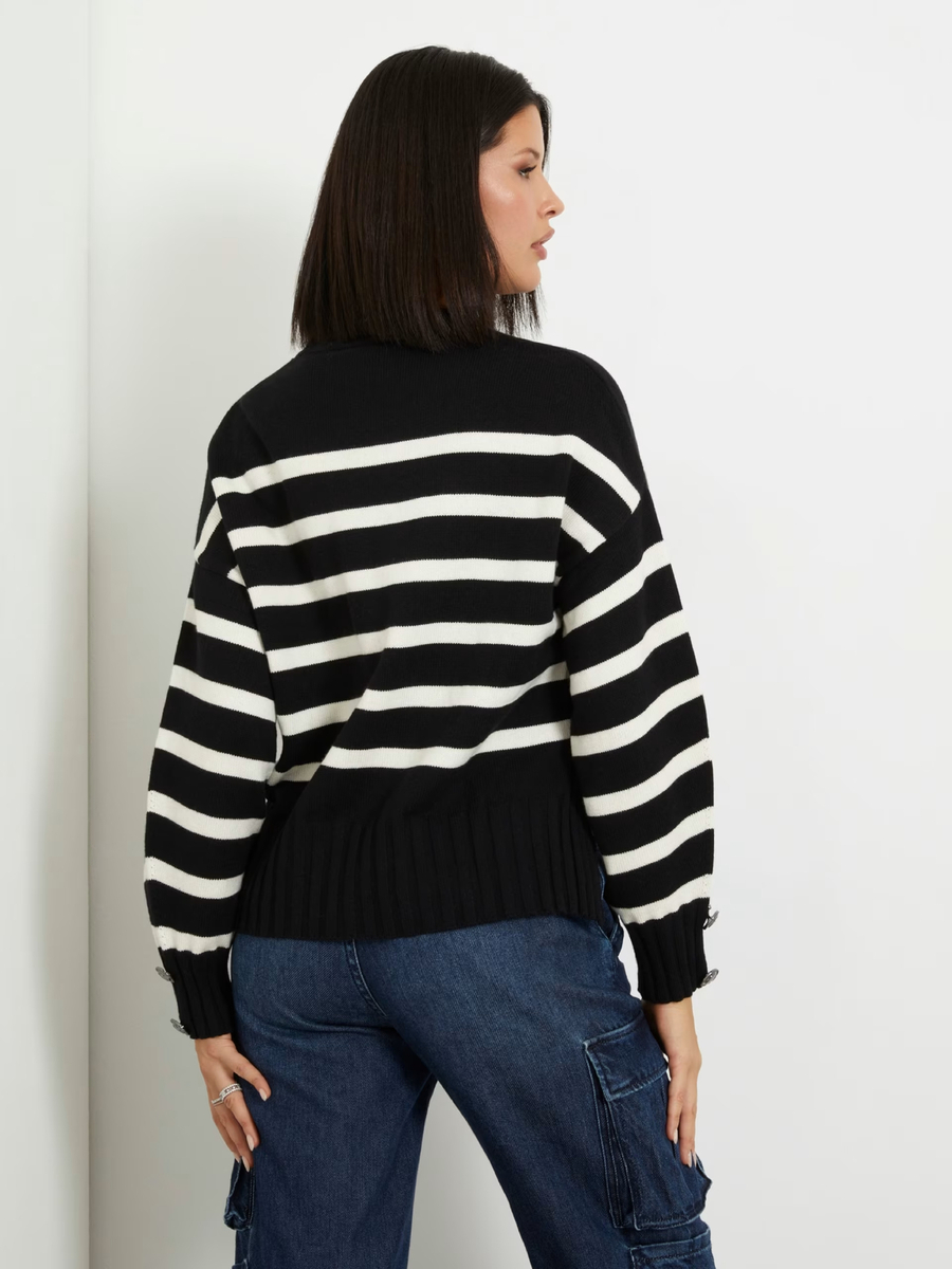 Svetr má rozparek na boku a knoflíčky na rukávu.