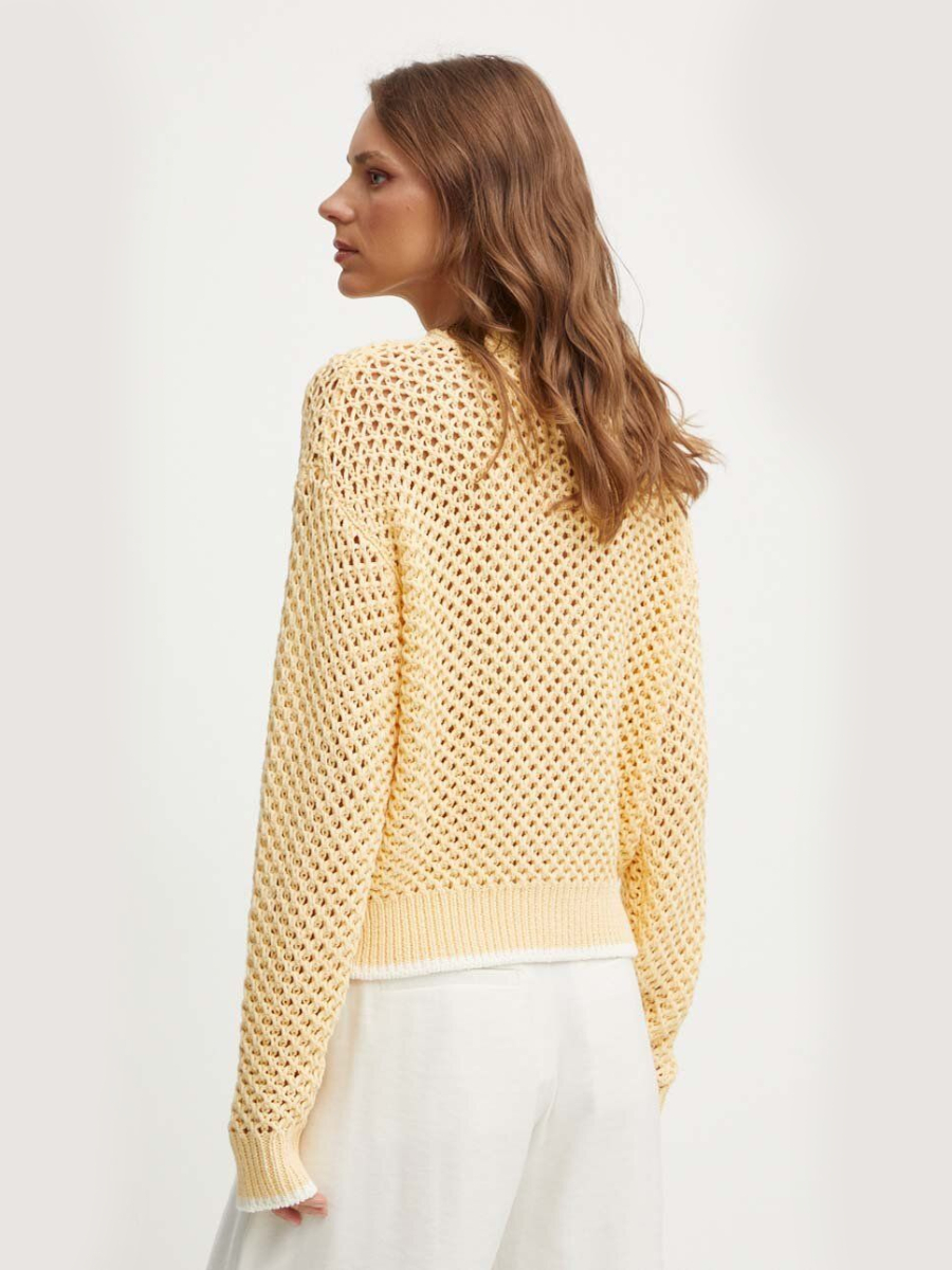 Svetr z bavlněného úpletu, háčkovaného stylu.