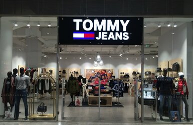 Prodej oblečení a doplňků z aktuálních kolekcí značek Tommy Jeans a Guess.