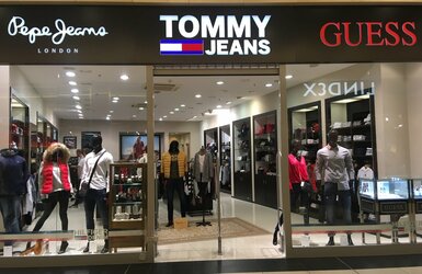Prodej oblečení a doplňků z aktuálních kolekcí značek Tommy Jeans, Pepe Jeans a Guess.
