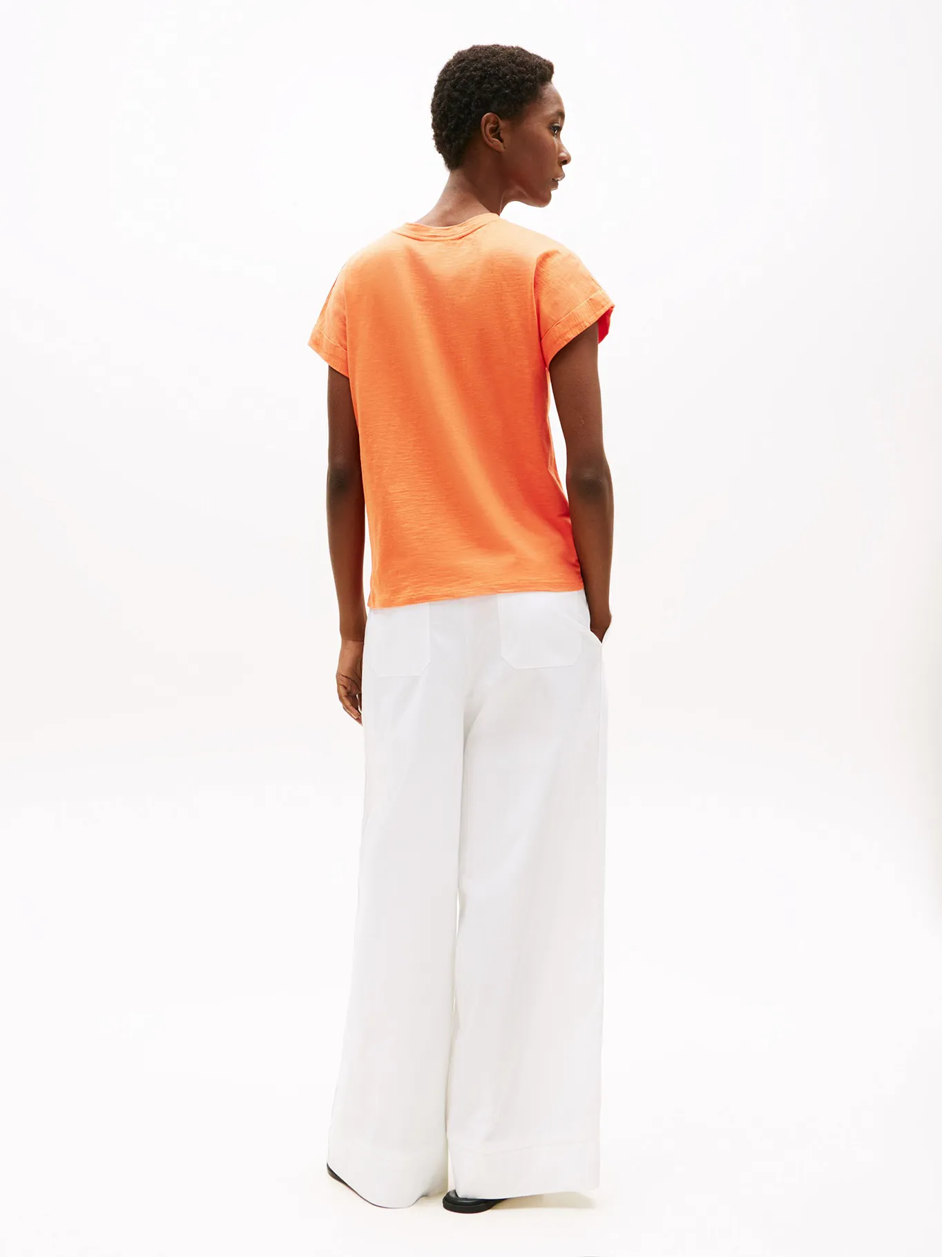 Tričko má kulatý výstřih a ohrnuté rukávy.