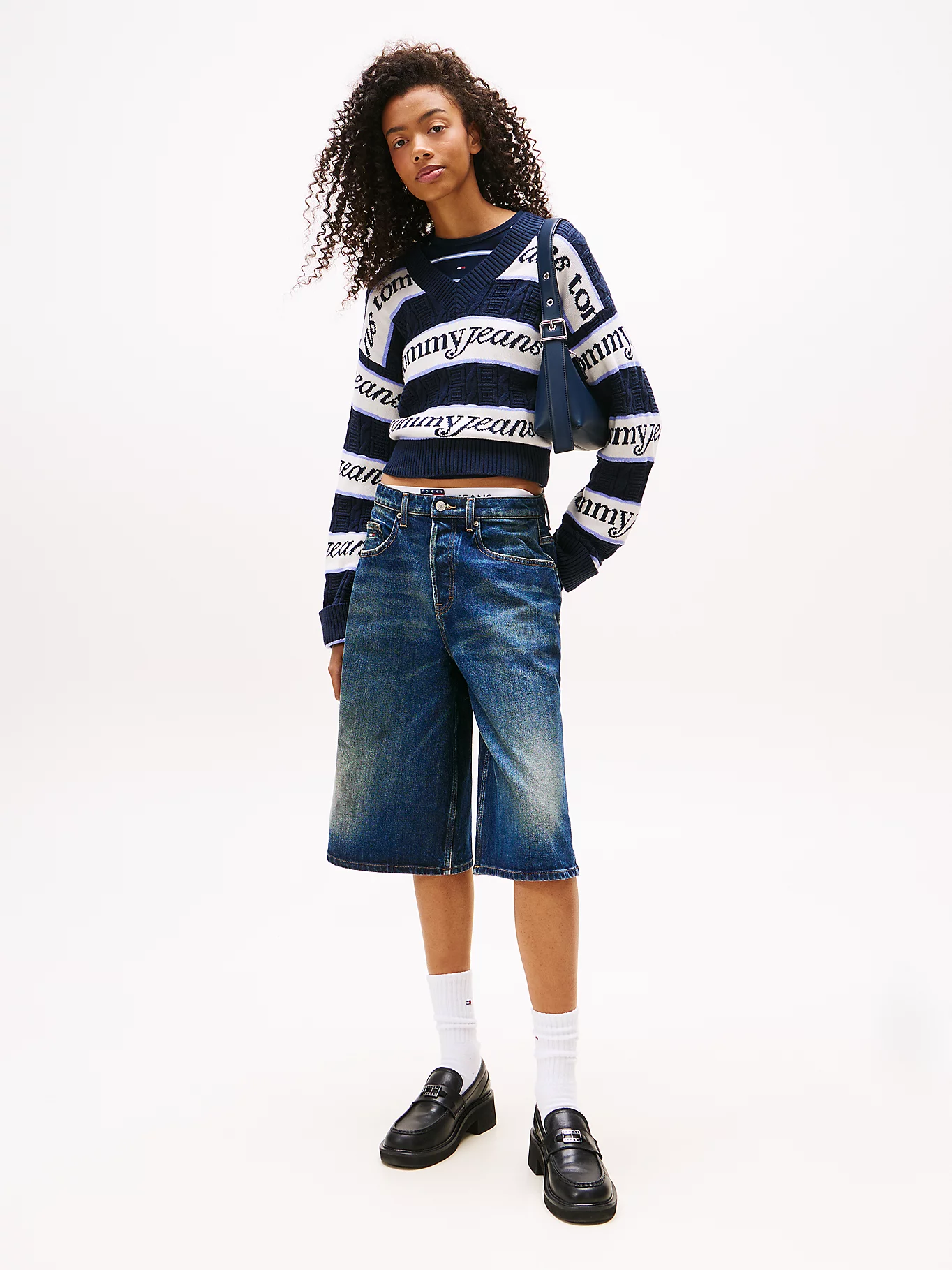 Dámský pruhovaný tmavě modrý svetr od Tommy Jeans.