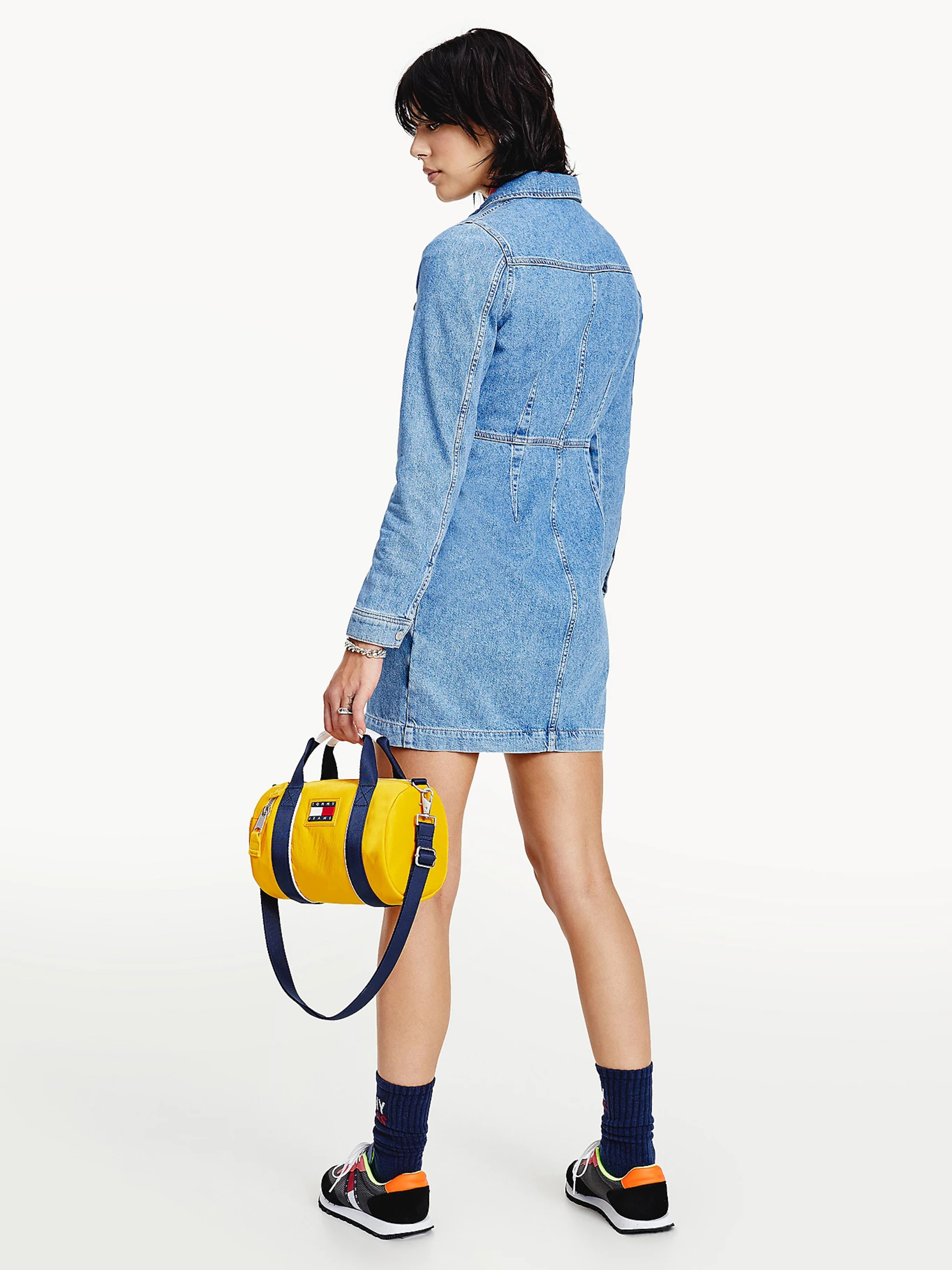 Šaty jsou vyrobeny z pevného denimu, mají dlouhý rukáv a mini délku.